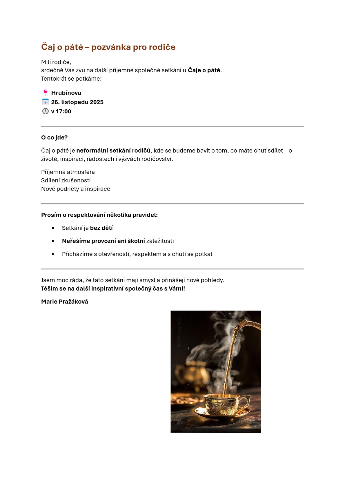 Děkujeme také vám, rodičům, za podporu, trpělivost a spolupráci. Doufáme, že se brzy všichni setkáme při některé z tradičních akcí školy, kde budeme moci společně sdílet radost z každodenního života našich dětí.